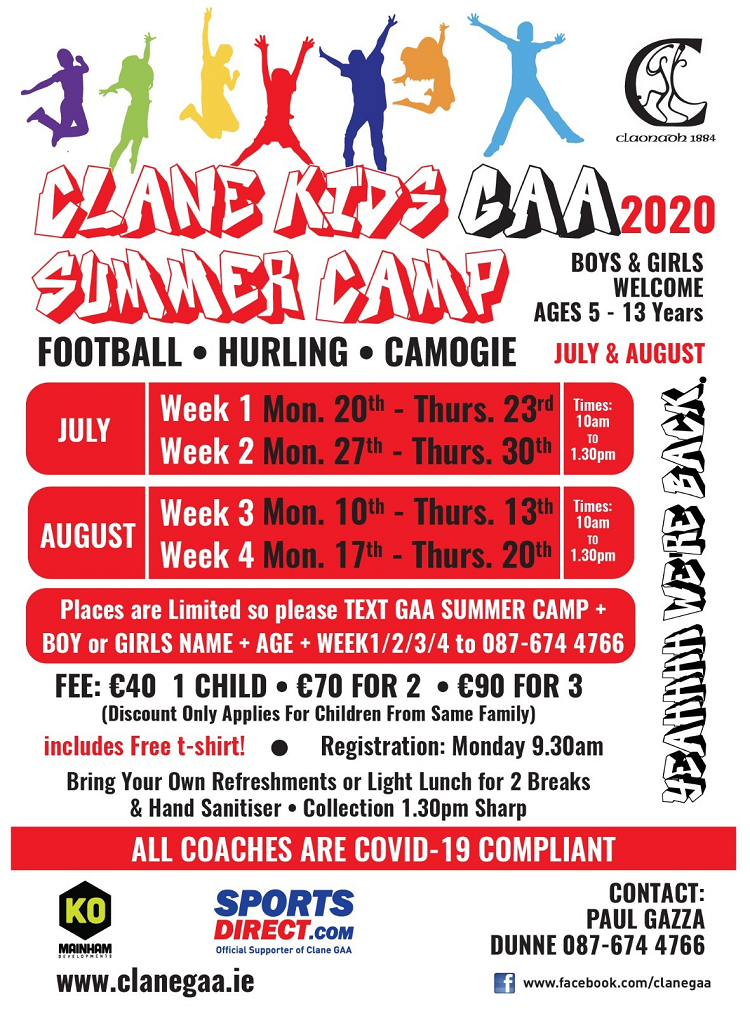 Please register your children now as numbers are limited - Text GAA Summer Camp + Boy or Girls Name + Age + Week 1/2/3/ or 4 to 087-6744766